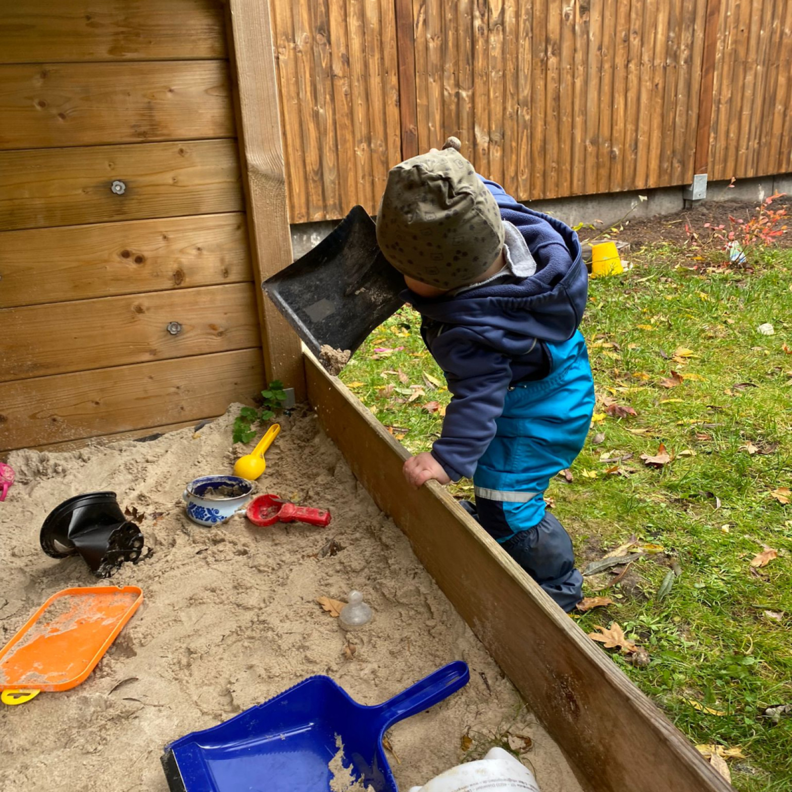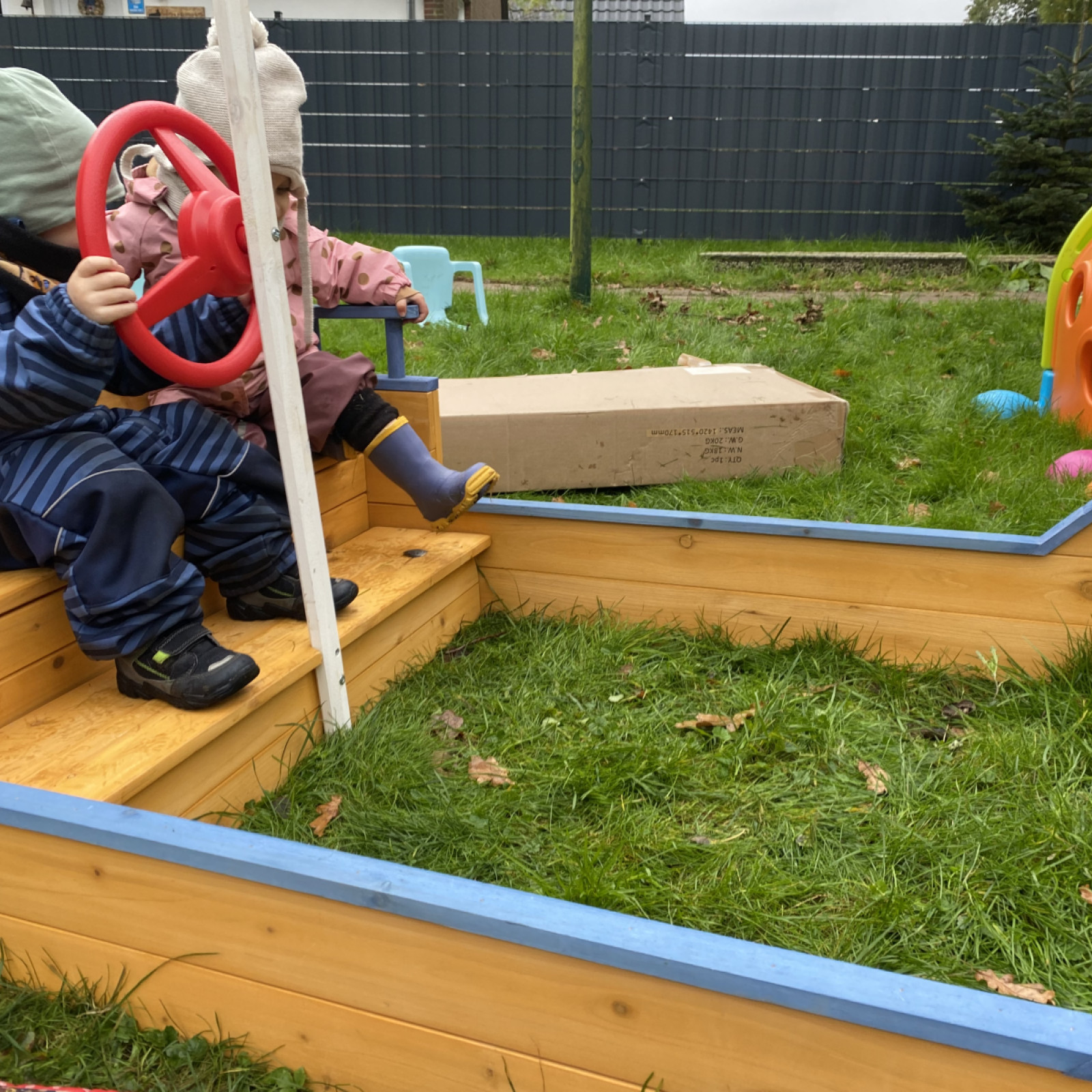 Sandkiste und unsere Hochbeete finden sich hier. Der Außenbereich wird